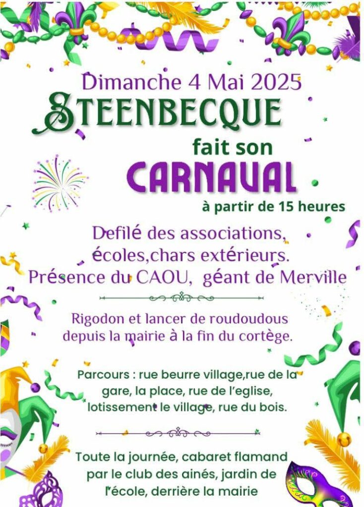 2025 – Steenbecque fait son Carnaval (Steenbecque) Date de l’événement : 4 Mai 2025 Lieu de l’événement : Steenbecque Organisateur : Comité des fête de Steenbecque